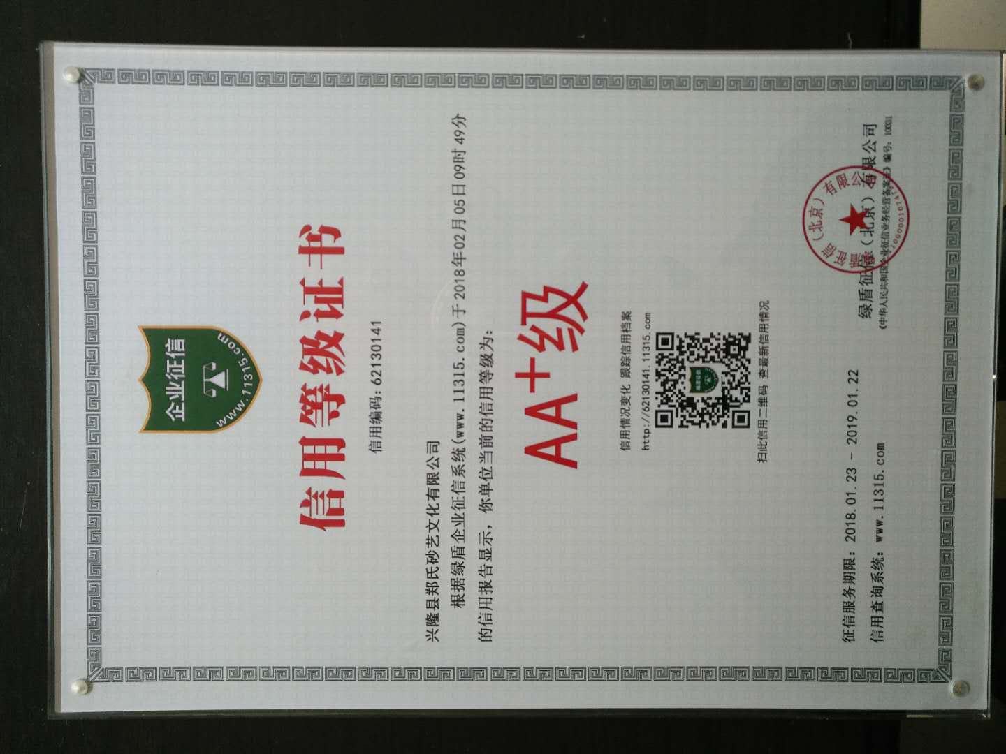 2018年2月5日,興隆縣鄭氏砂藝文化有限公司信用等級被綠盾征信(北京)有限公司確認為AA+級。信用等級證書編碼為62130141。這預示著我公司的信用等級在不斷提升。