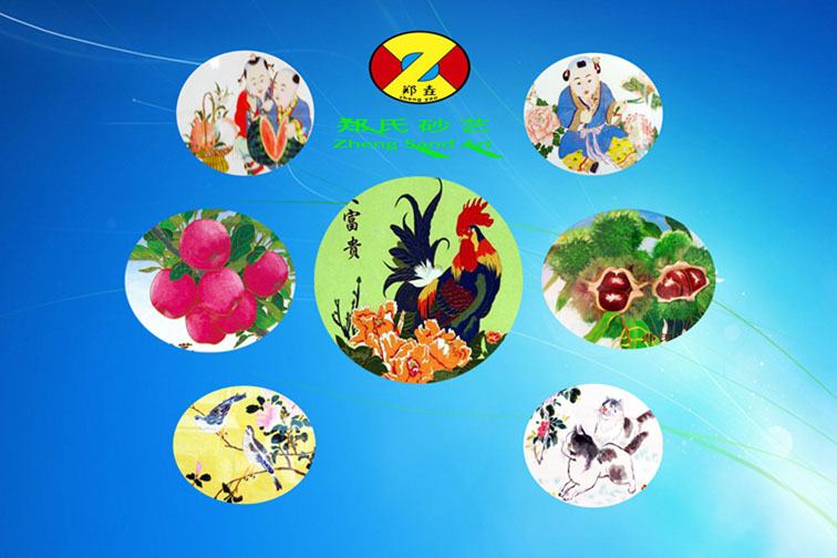 鄭氏砂藝畫,始創(chuàng)于晚清秀才鄭克祥,距今已有180多年的歷史。聽老一輩人口口相傳和史料記載,作為天祖的晚清秀才鄭克祥,酷愛讀書,習(xí)字繪畫,也愛游山玩水,游學(xué)中發(fā)現(xiàn)了一種新奇的作畫方式,他們的材質(zhì)不是筆墨紙硯,而是從自然界中提煉出的精細(xì)砂礫,先用樹木的纖細(xì)枝條勾勒出畫面的主要輪廓,再用天然彩砂作為畫面的色彩,用榆樹皮熬膠粘接,做出的畫面色彩靚麗,線條舒暢而且能久藏卻不褪色,于是便認(rèn)真地學(xué)習(xí)起來,學(xué)習(xí)研究中發(fā)現(xiàn)這種砂畫有畫面不牢固容易破損的缺點(diǎn),隨即對砂畫的不足之處進(jìn)行了大膽的改革創(chuàng)新,使砂畫作品大大提升了檔次,許多作品被商賈人士收藏,就是當(dāng)?shù)乜h官、州官也常常購買進(jìn)貢朝廷,博得皇帝喜愛、收藏。從此我們祖上的鄭氏砂畫立腕成名且名揚(yáng)當(dāng)時(shí)。