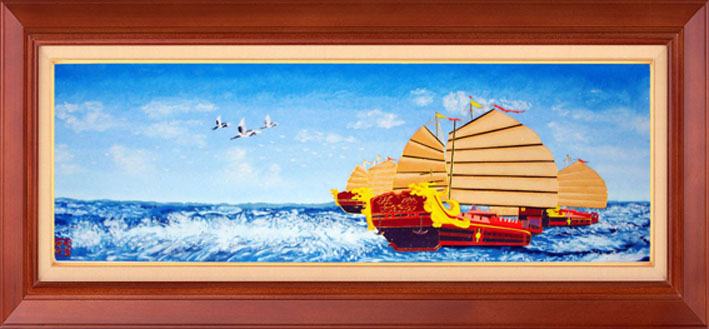 說話間,一副陰郁的表情浮上了鄭總的臉上:后因連年災(zāi)荒和戰(zhàn)亂,祖上便舉家從山東登州府遷至剛剛開封不久的河北興隆。雖然家境貧寒但創(chuàng)作砂畫的手藝并沒有放棄,也曾代代相傳。但終于經(jīng)不住連年的災(zāi)荒和戰(zhàn)亂,特別是那個(gè)“十年動(dòng)亂”,砂畫被當(dāng)作“四舊”而掃進(jìn)了“歷史垃圾堆”。從此我們鄭氏砂畫的制作工藝便失傳了多年。直到2000年,作為鄭克祥第五代嫡孫的我,無意間發(fā)現(xiàn)了砂畫這樣的作品,才萌發(fā)重振祖業(yè)的念頭。于是,下山東、走登州,尋根問祖,拜師學(xué)藝。2001年在老家創(chuàng)建了制作砂畫的“工藝美術(shù)部”,2009年搬遷至興隆縣城,2010年10月成立了興隆縣鄭氏砂藝文化有限公司, 經(jīng)過一番努力,鄭氏砂畫終于在2016年被評為河北省非物質(zhì)文化遺產(chǎn)。