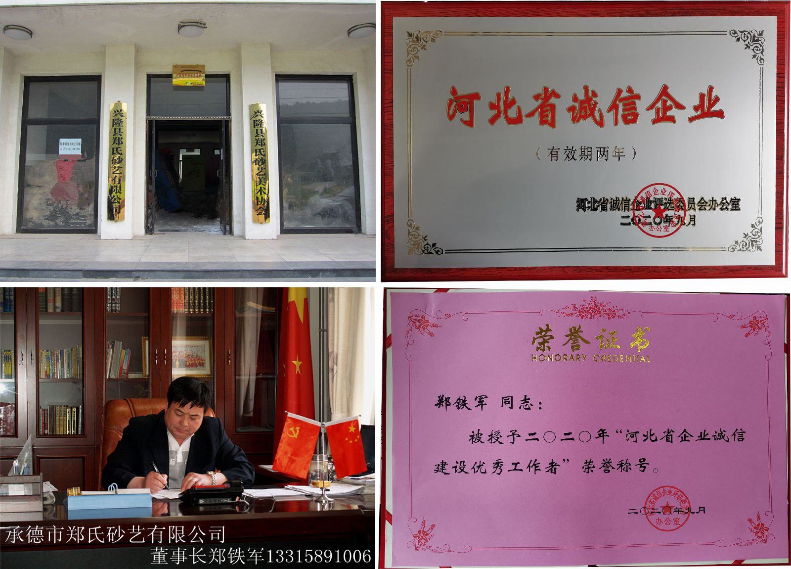 興隆縣鄭氏砂藝文化有限公司董事長鄭鐵軍同志被授予“2020年度河北省企業(yè)誠信建設(shè)優(yōu)秀工作者”榮譽稱號。