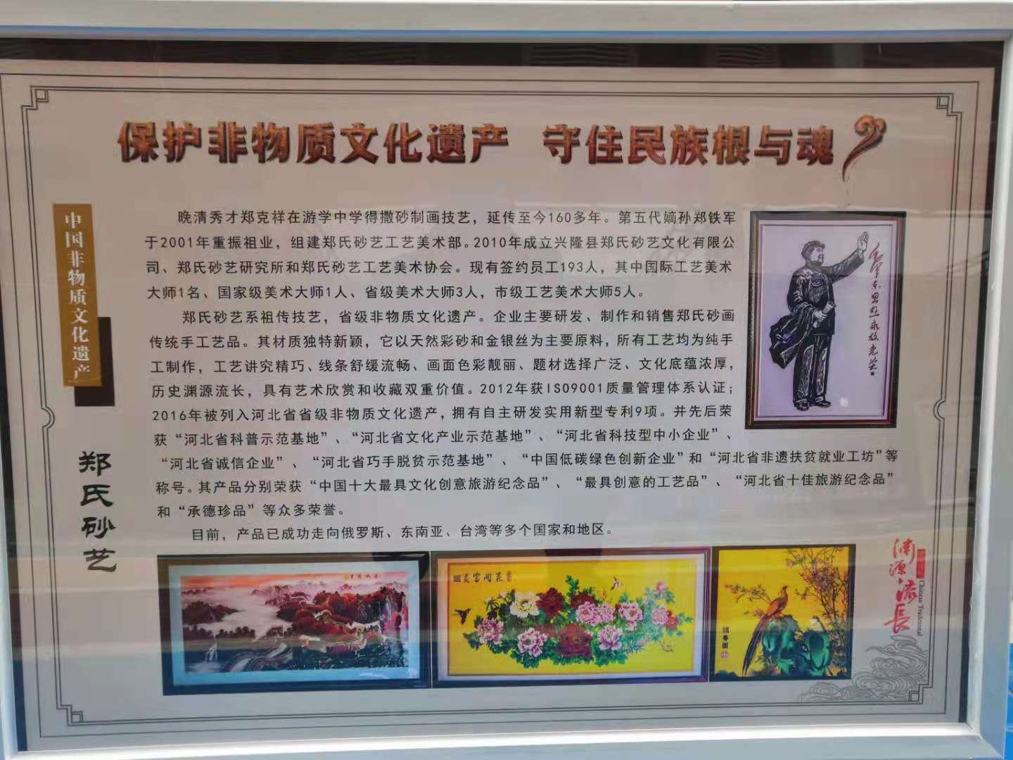 2021年5月15日,鄭氏砂藝應(yīng)邀參加三河市文化廣電和旅游局 “2021 年中國(guó)旅游日京津冀文旅資源推介暨 ‘京東文旅圈’成立”系列活動(dòng),活動(dòng)旨在有效推動(dòng)京津冀協(xié)同發(fā)展重大國(guó)家戰(zhàn)略,加快推進(jìn)興隆縣、遵化市、三河市等京東九縣(市、區(qū))一體化發(fā)展步伐,構(gòu)建文旅定位精準(zhǔn)清晰、資源高效利用、產(chǎn)業(yè)集群發(fā)展的區(qū)域發(fā)展新格局,共同打造京津冀文旅協(xié)同發(fā)展區(qū)。興隆縣旅游和文化廣電局局長(zhǎng)莊云飛帶領(lǐng)我縣特色文旅企業(yè)參加了此次活動(dòng),其中鄭氏砂藝代表我縣非遺文化產(chǎn)業(yè)出席活動(dòng),展出特色砂畫(huà)作品51幅,展出效果良好,得到了參觀人員一致好評(píng)。