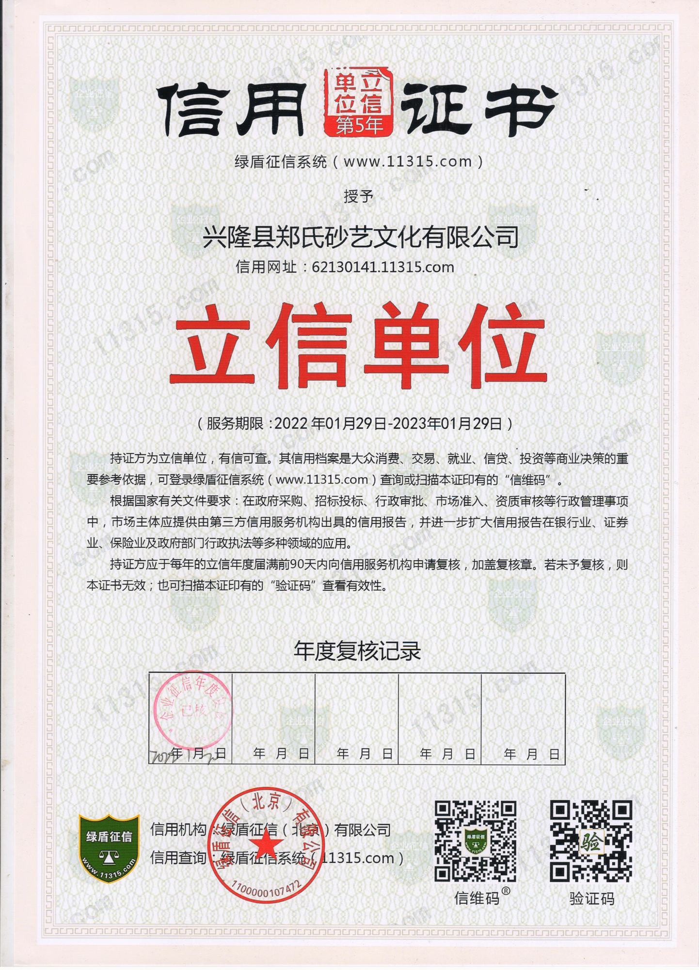 2022年,根據(jù)綠盾企業(yè)征信系統(tǒng)(www.11315.com)采集、整理、保存、加工的信息,經(jīng)綜合信用評(píng)價(jià)模型自動(dòng)評(píng)估,興隆縣鄭氏砂藝文化有限公司被評(píng)為AAA級(jí)信用企業(yè),并授予綠盾征信“信用證書(shū)”,企業(yè)已連續(xù)五年獲此殊榮。