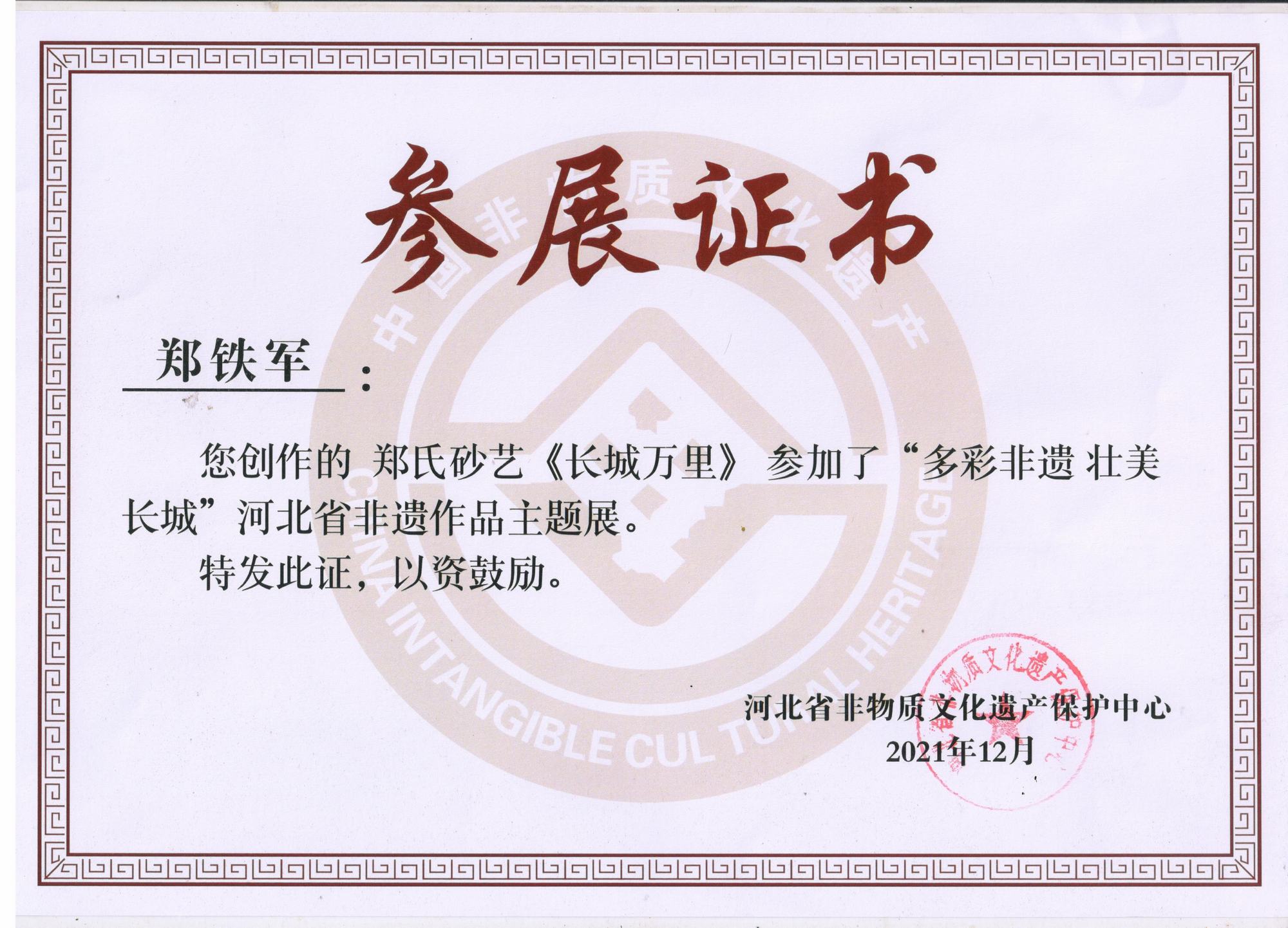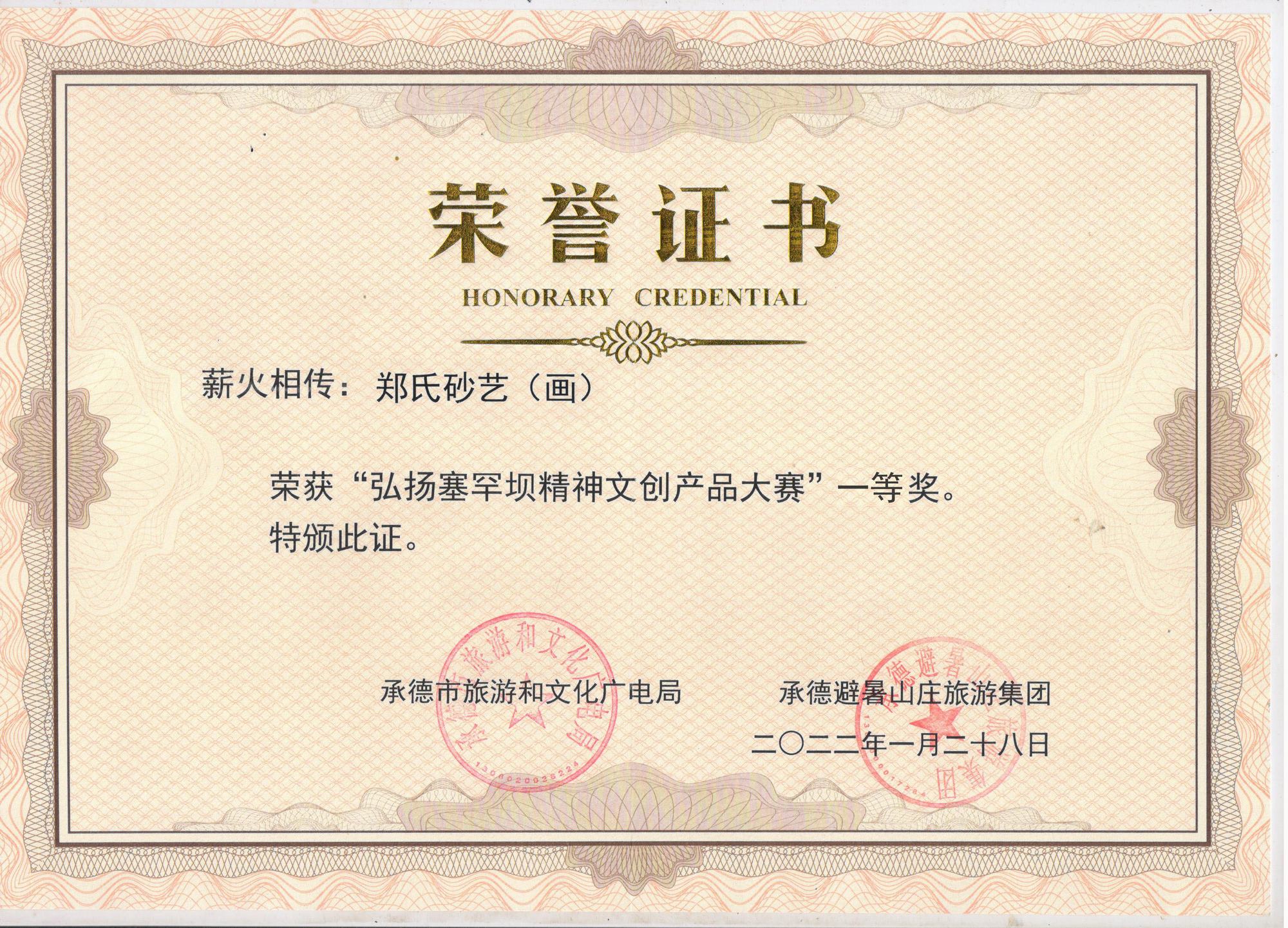近期,鄭氏砂藝多次應(yīng)邀參加了省、市相關(guān)單位舉辦的各項(xiàng)展出活動(dòng),參展的非遺砂畫(huà)作品和研發(fā)的旅游商品得到了社會(huì)各界人士的一致好評(píng),被活動(dòng)組委會(huì)給予了很大的肯定,在一定程度上提高了我縣和“非遺”文化鄭氏砂藝的知名度。2021年12月,鄭鐵軍董事長(zhǎng)的砂畫(huà)作品《長(zhǎng)城萬(wàn)里》入選“多彩非遺 壯美長(zhǎng)城”河北省非遺作品主題展,并在河北省“非遺”保護(hù)中心展出。2022年1月,鄭氏砂藝砂畫(huà)作品《薪火相傳》榮獲“弘揚(yáng)塞罕壩精神文創(chuàng)產(chǎn)品大賽”一等獎(jiǎng)。2022年1月,鄭氏砂藝多項(xiàng)作品在承德市旅游協(xié)會(huì)舉辦的“傳承非遺手工技藝、助力鄉(xiāng)村振興”活動(dòng)榮獲獎(jiǎng)項(xiàng)。2022年2月,鄭氏砂藝董事長(zhǎng)鄭鐵軍在全市開(kāi)展的“鄉(xiāng)村振興黨旗紅 文藝創(chuàng)新樹(shù)先鋒”活動(dòng)中表現(xiàn)突出,榮獲“承德市2021年度優(yōu)秀鄉(xiāng)村文藝家會(huì)員”稱號(hào)。