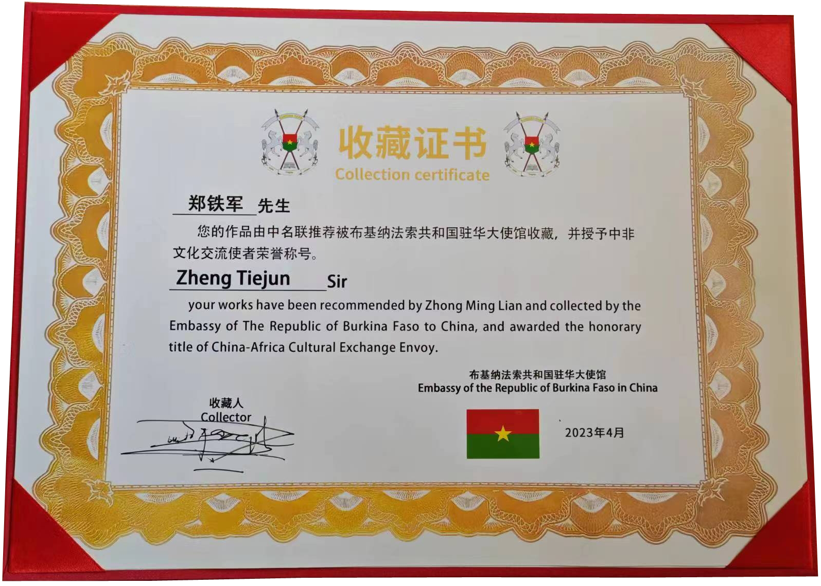 鄭鐵軍先生的作品曾多次參加國內(nèi)大型會展,并被多家展館收藏。2023年4月,其作品再次被布基納法索共和國駐華大使館收藏并頒發(fā)證書,并被作為國禮收藏,為兩國友好合作的美好愿望添磚加瓦。