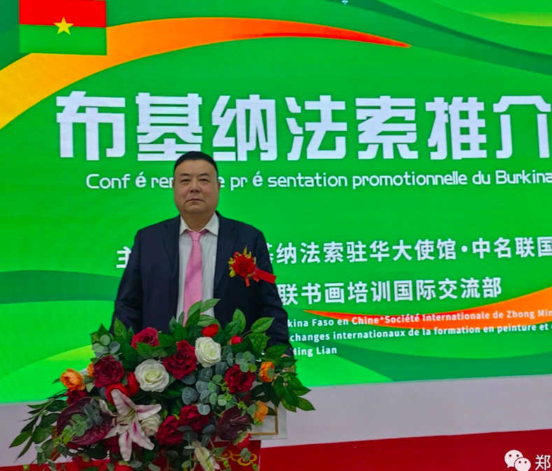 (中名聯(lián)文創(chuàng)園圖片說(shuō)明:布基納法索共和國(guó)駐華大使館領(lǐng)導(dǎo)帕爾﹣伊薩﹣約瑟夫先生上臺(tái)演講,明確表示非常開(kāi)心在中名聯(lián)國(guó)際展廳舉辦布基納法索國(guó)家推介會(huì))
