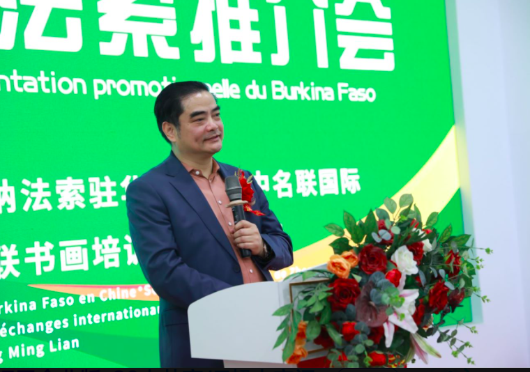 (中名聯(lián)工藝美術(shù)大師培訓(xùn)國(guó)際交流部圖片說(shuō)明:中名聯(lián)集團(tuán)戴本領(lǐng)先生在布基納法索國(guó)家推介會(huì)上發(fā)言。)