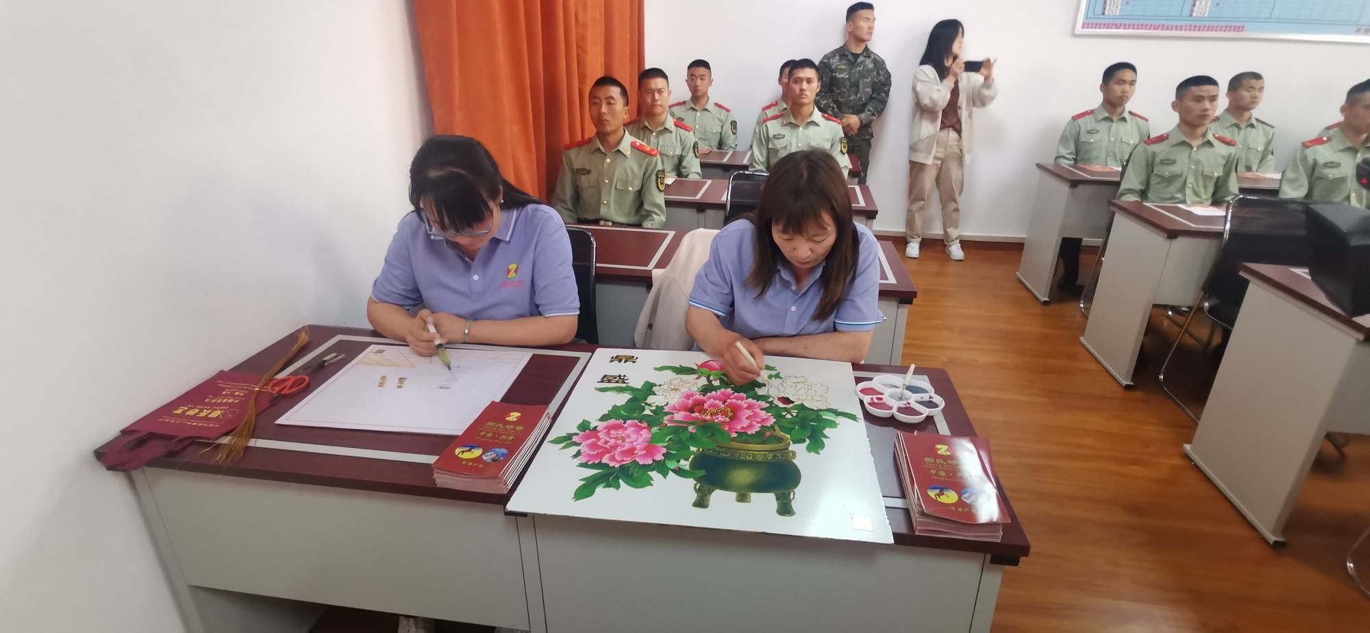 在活動現(xiàn)場,鄭氏砂藝(畫)團隊成員們向觀眾介紹了砂畫的基本知識和制作過程,分享了砂藝(畫)的歷史和技藝,讓大家對這種傳統(tǒng)藝術(shù)形式有了更深入的了解,并展示了一些精美的砂藝(畫)作品,軍官們對于這種傳統(tǒng)的文化藝術(shù)表現(xiàn)出了濃厚的興趣和熱情。同時,他們還與觀眾互動,讓大家一起參與到砂畫創(chuàng)作中來,讓大家感受到了傳統(tǒng)文化的魅力和趣味性。