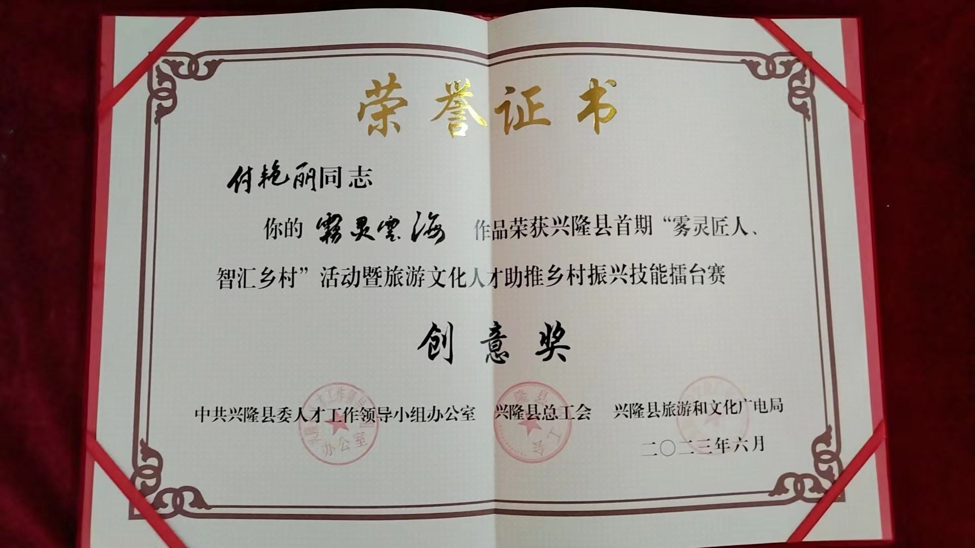 據(jù)了解,此次活動(dòng)由興隆縣委人才辦、縣總工會(huì)、縣旅游和文化廣電聯(lián)合舉辦,興隆縣文化館協(xié)助組織,來自京津冀專業(yè)名家認(rèn)真評(píng)審。全縣入圍的60余件書法美術(shù)、攝影、民間工藝美術(shù)、導(dǎo)游解說等四項(xiàng)共評(píng)比“霧靈匠人獎(jiǎng)”5名,創(chuàng)意獎(jiǎng)10名,優(yōu)秀獎(jiǎng)9名。歷時(shí)兩個(gè)月完美落幕。其中鄭氏砂藝砂畫技師付艷麗作品《霧靈云海》參加了此次評(píng)選,并榮獲民間工藝美術(shù)制作競賽類創(chuàng)意獎(jiǎng)。