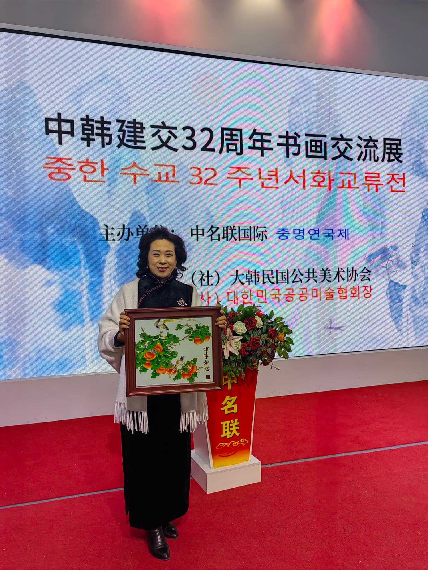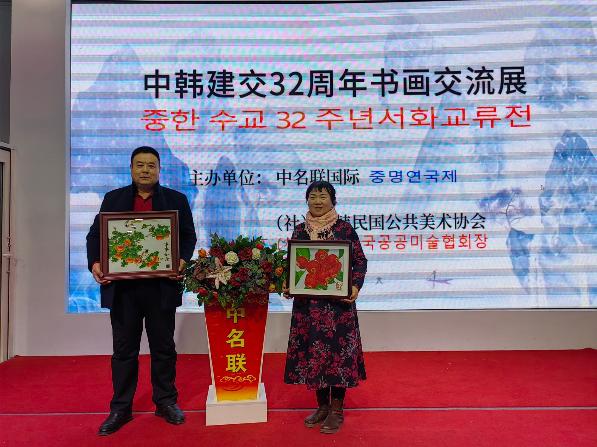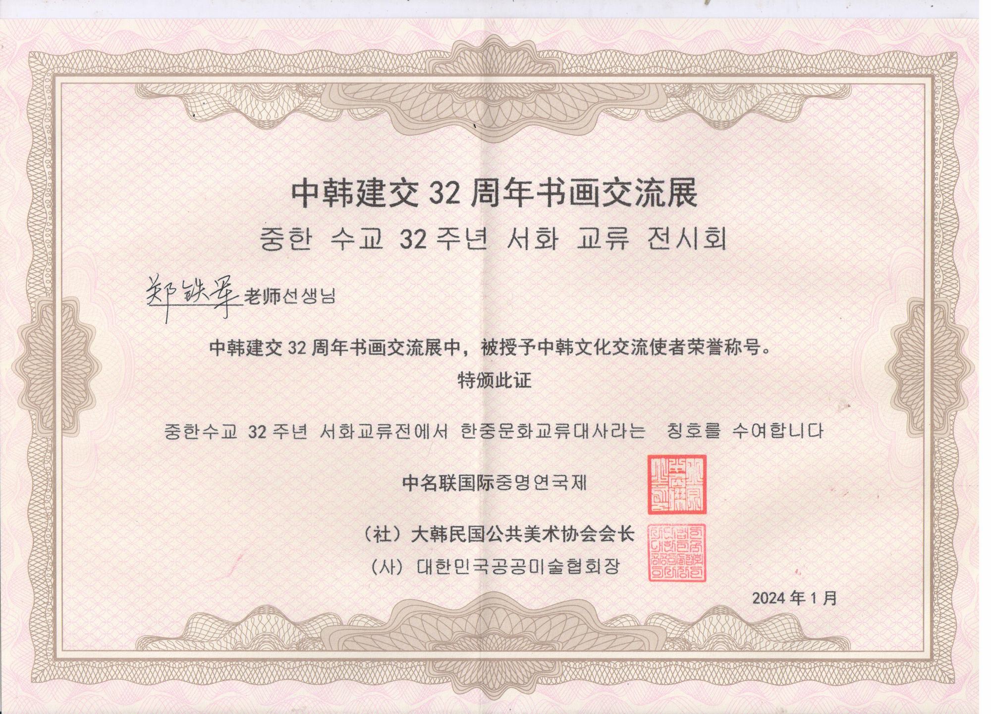 2024年1月28日,中韓建交32周年中韓藝術(shù)交流展在北京中名聯(lián)國際展廳隆重召開,活動由中名聯(lián)國際和大韓民國公共美術(shù)協(xié)會共同主辦,主要目的是加深中韓藝術(shù)家們的友誼和文化交流,加強(qiáng)中韓兩國人民友誼。鄭氏砂藝第五代非遺傳承人、中名聯(lián)簽約國禮藝術(shù)家鄭鐵軍先生應(yīng)邀出席了此次活動,其鄭氏砂藝(畫)被大韓民國公共美術(shù)協(xié)會永久收藏,并授予鄭鐵軍“中韓文化交流使者”榮譽(yù)稱號。同時,韓方表示屆時將邀請中名聯(lián)簽約國禮藝術(shù)家赴韓國國會展覽,搭建中韓深化文化藝術(shù)交流橋梁。