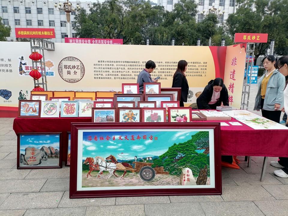 在展覽現(xiàn)場,鄭氏砂藝展區(qū)人頭攢動,熱鬧非凡。一系列精心創(chuàng)作的砂藝藝術(shù)品,如《國泰民安》《沿著社會主義大道奔前方》《興隆山》《霧靈山》《天文臺》及《紅紅火火》等,吸引了眾多觀眾的目光。這些作品不僅展現(xiàn)了鄭氏砂藝精湛的制作工藝和獨(dú)特的藝術(shù)風(fēng)格,更蘊(yùn)含了對祖國繁榮昌盛、人民幸福安康的美好祝愿。鄭氏砂藝的展品憑借其獨(dú)特的藝術(shù)魅力和深刻的主題內(nèi)涵,贏得了廣大父老鄉(xiāng)親的喜愛和贊賞。觀眾們紛紛駐足觀賞,拍照留念,更有不少人表示被這些作品深深打動,感受到了濃厚的愛國情懷和藝術(shù)氛圍。