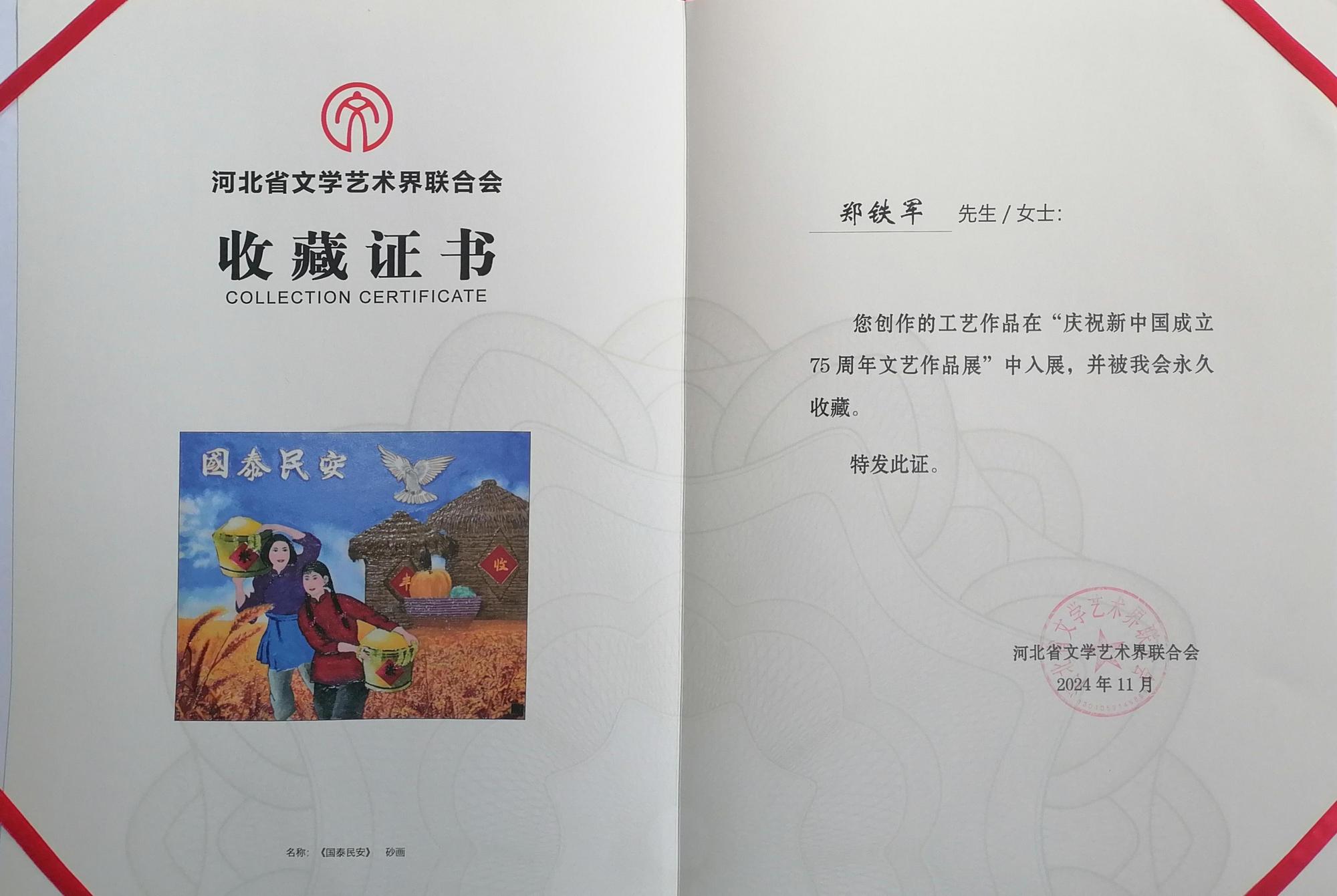 近期,在河北省文學藝術(shù)界聯(lián)合會舉辦的“慶祝新中國成立75周年文藝創(chuàng)作展”中,由鄭鐵軍創(chuàng)作的《國泰民安》憑借其獨特的藝術(shù)魅力和深厚的文化底蘊,被河北省文學藝術(shù)界聯(lián)合會永久收藏,成為本次展覽的一大亮點。