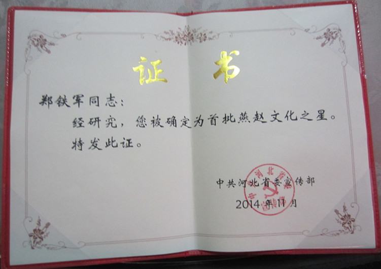2014年11月,鄭鐵軍同志被省委宣傳部確定為《首屆河北省燕趙文化之星》。同時(shí)與他獲此殊榮的還有縣文化館副館長(zhǎng)錢飛龍同志。