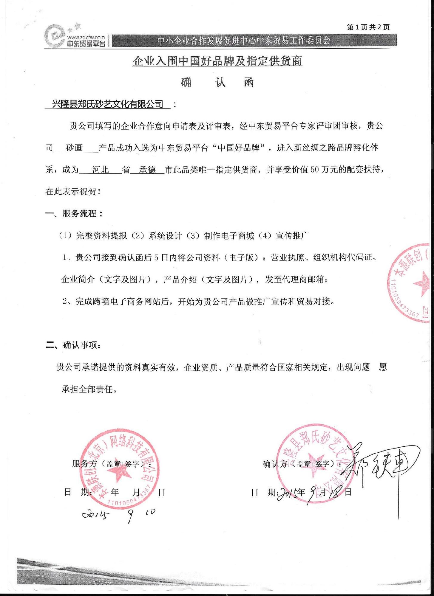 2015年9月10日,經(jīng)中東貿(mào)易平臺專家評審團(tuán)審核,本公司的砂畫產(chǎn)品成功入選為中東貿(mào)易平臺“中國好品牌”,進(jìn)入新絲綢之路品牌孵化體系,成為河北省承德市此品類唯一指定供貨商,并享受價(jià)值50萬元的配套扶持。