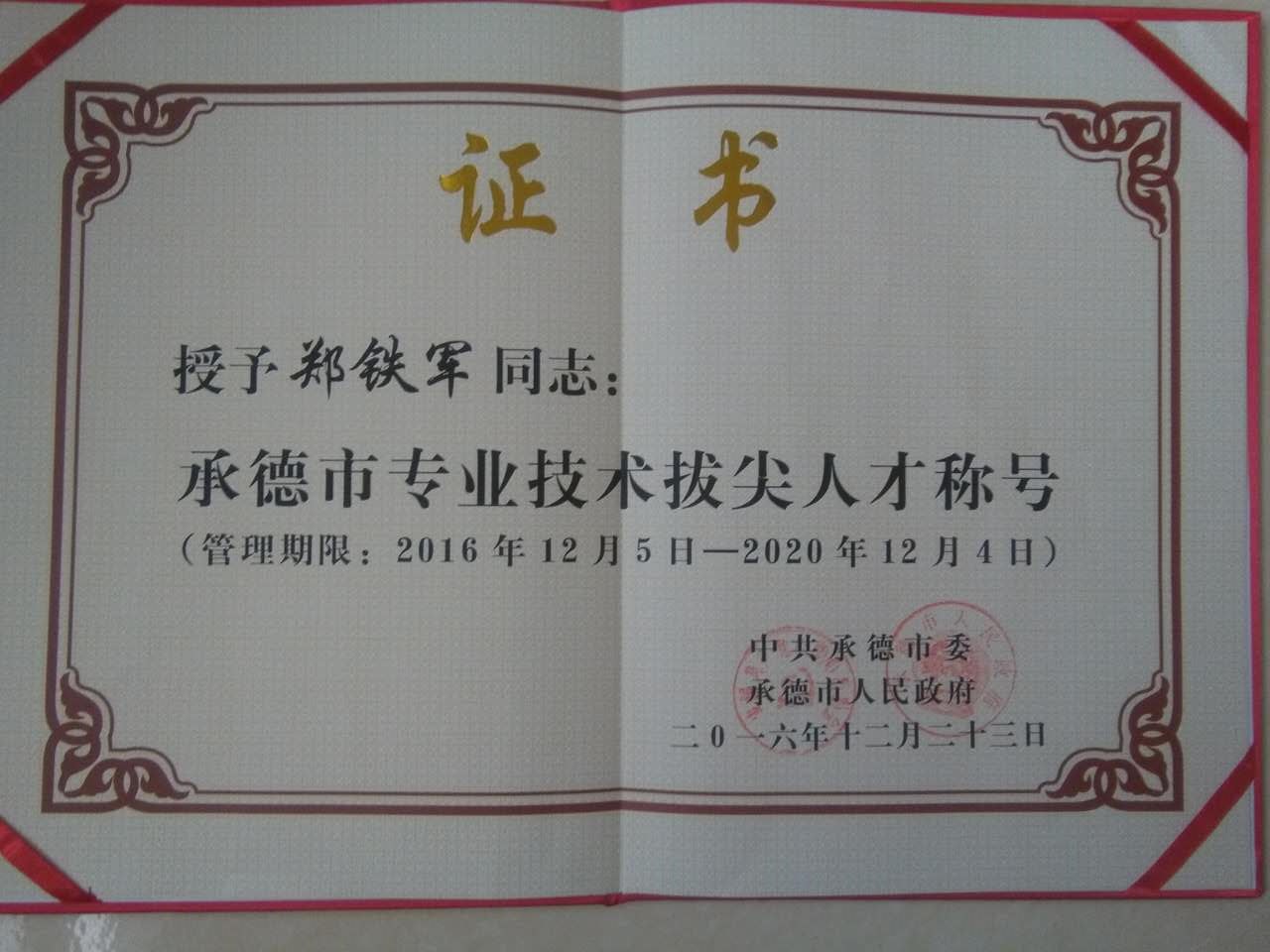 2016年12月23日,中共承德市委、承德市人民政府授予興隆縣鄭氏砂藝文化有限公司董事長(zhǎng)兼總經(jīng)理鄭鐵軍先生《承德市專(zhuān)業(yè)技術(shù)拔尖人才》稱(chēng)號(hào),以表彰他在非遺文化傳承保護(hù)和傳統(tǒng)文化產(chǎn)業(yè)發(fā)展以及帶動(dòng)農(nóng)民脫貧致富工作中所作出的貢獻(xiàn)。