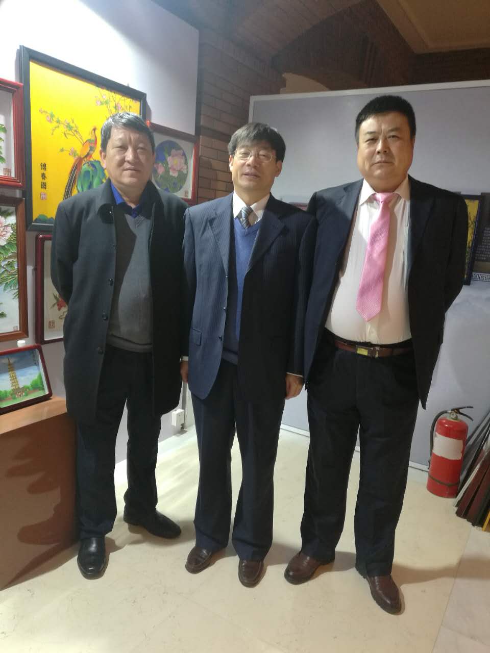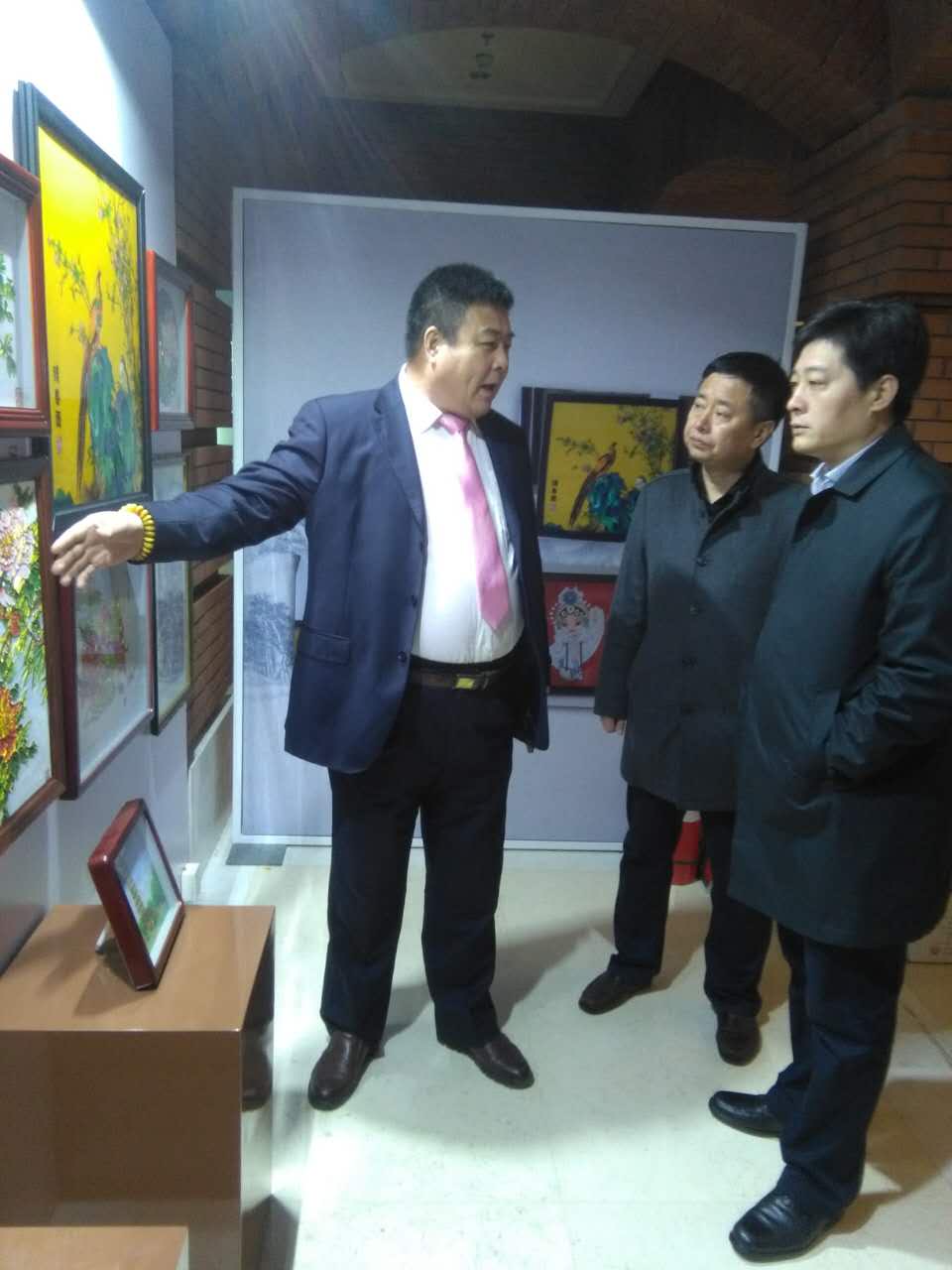 鄭總在向興隆縣副縣長高春青(中)、天津市北辰區(qū)人民政府合作交流辦公室主任陳炳坤(右)介紹砂畫特色工藝。